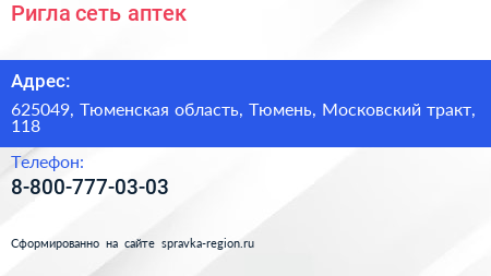 Ригла, сеть аптек по адресу 625049, Тюменская область, Тюмень, Московский тракт, 118 в дальнейшем Организация, размещена в следующих категориях: