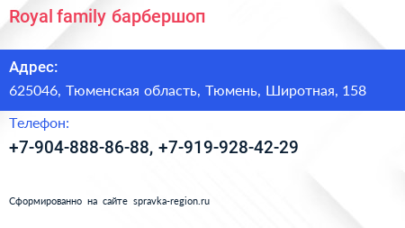 Royal family, барбершоп по адресу 625046, Тюменская область, Тюмень, Широтная, 158 в дальнейшем Организация, размещена в следующих категориях: