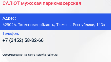 САЛЮТ, мужская парикмахерская по адресу 625026, Тюменская область, Тюмень, Республики, 143а в дальнейшем Организация, размещена в следующих категориях: