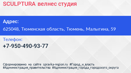 SCULPTURA, велнес-студия по адресу 625048, Тюменская область, Тюмень, Малыгина, 59 в дальнейшем Организация, размещена в следующих категориях: