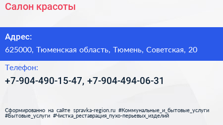 Салон красоты по адресу 625000, Тюменская область, Тюмень, Советская, 20 в дальнейшем Организация, размещена в следующих категориях:
