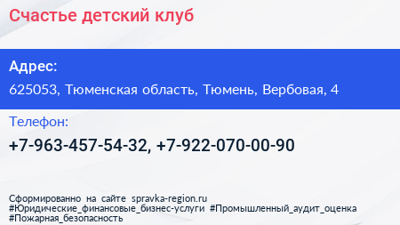 Счастье, детский клуб по адресу 625053, Тюменская область, Тюмень, Вербовая, 4 в дальнейшем Организация, размещена в следующих категориях: