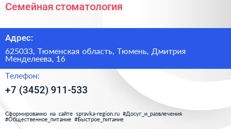 Семейная стоматология по адресу 625033, Тюменская область, Тюмень, Дмитрия Менделеева, 16 в дальнейшем Организация, размещена в следующих категориях: