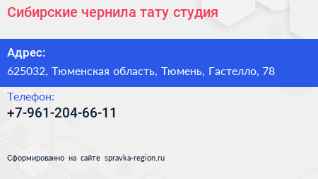 Сибирские чернила, тату-студия по адресу 625032, Тюменская область, Тюмень, Гастелло, 78 в дальнейшем Организация, размещена в следующих категориях: