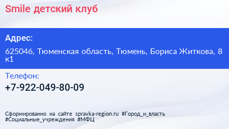 Smile, детский клуб по адресу 625046, Тюменская область, Тюмень, Бориса Житкова, 8 к1 в дальнейшем Организация, размещена в следующих категориях: