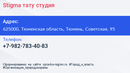 Stigma, тату-студия по адресу 625000, Тюменская область, Тюмень, Советская, 95 в дальнейшем Организация, размещена в следующих категориях: