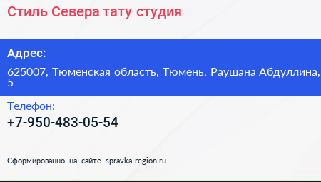 Стиль Севера, тату-студия по адресу 625007, Тюменская область, Тюмень, Раушана Абдуллина, 5 в дальнейшем Организация, размещена в следующих категориях: