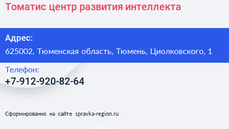 Томатис, центр развития интеллекта по адресу 625002, Тюменская область, Тюмень, Циолковского, 1 в дальнейшем Организация, размещена в следующих категориях: