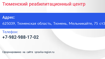 Тюменский реабилитационный центр по адресу 625039, Тюменская область, Тюмень, Мельникайте, 75 ст3 в дальнейшем Организация, размещена в следующих категориях: