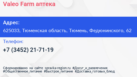 Valeo Farm, аптека по адресу 625033, Тюменская область, Тюмень, Федюнинского, 62 в дальнейшем Организация, размещена в следующих категориях: