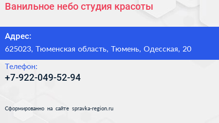Ванильное небо, студия красоты по адресу 625023, Тюменская область, Тюмень, Одесская, 20 в дальнейшем Организация, размещена в следующих категориях: