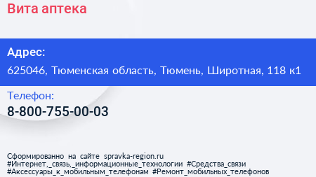 Вита, аптека по адресу 625046, Тюменская область, Тюмень, Широтная, 118 к1 в дальнейшем Организация, размещена в следующих категориях: