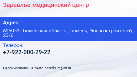 Зареалье, медицинский центр по адресу 625053, Тюменская область, Тюмень, Энергостроителей, 23/6 в дальнейшем Организация, размещена в следующих категориях: