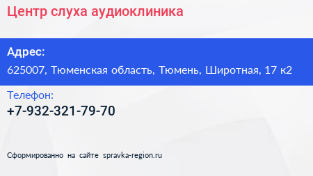 Центр слуха, аудиоклиника по адресу 625007, Тюменская область, Тюмень, Широтная, 17 к2 в дальнейшем Организация, размещена в следующих категориях: