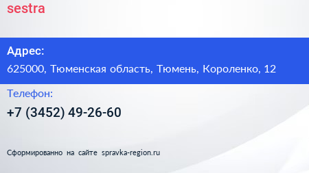 sestra по адресу 625000, Тюменская область, Тюмень, Короленко, 12 в дальнейшем Организация, размещена в следующих категориях: