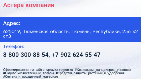 Астера, компания по адресу 625019, Тюменская область, Тюмень, Республики, 256 к2 ст3 в дальнейшем Организация, размещена в следующих категориях: