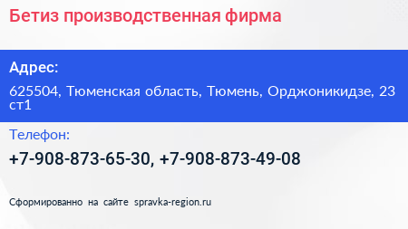 Бетиз, производственная фирма по адресу 625504, Тюменская область, Тюмень, Орджоникидзе, 23 ст1 в дальнейшем Организация, размещена в следующих категориях: