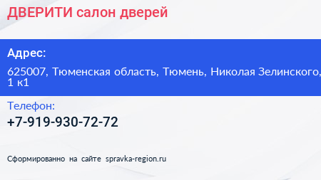 ДВЕРИТИ, салон дверей по адресу 625007, Тюменская область, Тюмень, Николая Зелинского, 1 к1 в дальнейшем Организация, размещена в следующих категориях: