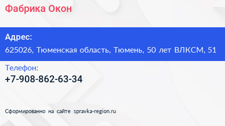 Фабрика Окон по адресу 625026, Тюменская область, Тюмень, 50 лет ВЛКСМ, 51 в дальнейшем Организация, размещена в следующих категориях: