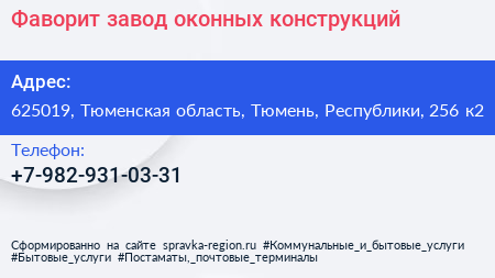 Фаворит, завод оконных конструкций по адресу 625019, Тюменская область, Тюмень, Республики, 256 к2 в дальнейшем Организация, размещена в следующих категориях:
