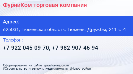 ФурниКом, торговая компания по адресу 625031, Тюменская область, Тюмень, Дружбы, 211 ст4 в дальнейшем Организация, размещена в следующих категориях: