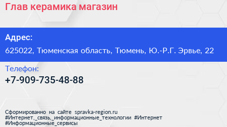 Глав керамика, магазин по адресу 625022, Тюменская область, Тюмень, Ю.-Р.Г. Эрвье, 22 в дальнейшем Организация, размещена в следующих категориях: