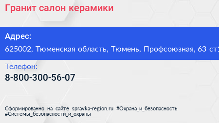 Гранит, салон керамики по адресу 625002, Тюменская область, Тюмень, Профсоюзная, 63 ст1 в дальнейшем Организация, размещена в следующих категориях: