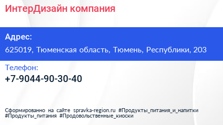 ИнтерДизайн, компания по адресу 625019, Тюменская область, Тюмень, Республики, 203 в дальнейшем Организация, размещена в следующих категориях: