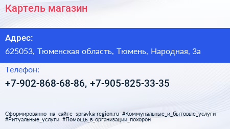 Картель, магазин по адресу 625053, Тюменская область, Тюмень, Народная, 3а в дальнейшем Организация, размещена в следующих категориях:
