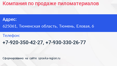 Компания по продаже пиломатериалов по адресу 625061, Тюменская область, Тюмень, Еловая, 6 в дальнейшем Организация, размещена в следующих категориях: