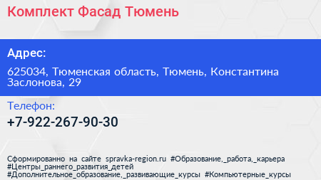 Комплект-Фасад-Тюмень по адресу 625034, Тюменская область, Тюмень, Константина Заслонова, 29 в дальнейшем Организация, размещена в следующих категориях: