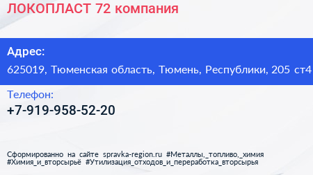 ЛОКОПЛАСТ-72, компания по адресу 625019, Тюменская область, Тюмень, Республики, 205 ст4 в дальнейшем Организация, размещена в следующих категориях: