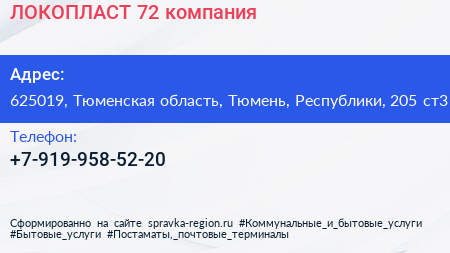 ЛОКОПЛАСТ-72, компания по адресу 625019, Тюменская область, Тюмень, Республики, 205 ст3 в дальнейшем Организация, размещена в следующих категориях: