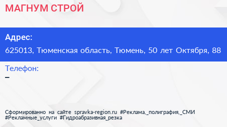 МАГНУМ СТРОЙ по адресу 625013, Тюменская область, Тюмень, 50 лет Октября, 88 в дальнейшем Организация, размещена в следующих категориях: