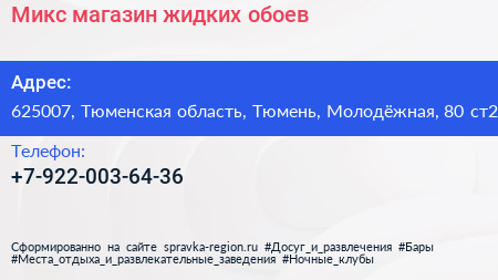 Микс, магазин жидких обоев по адресу 625007, Тюменская область, Тюмень, Молодёжная, 80 ст2 в дальнейшем Организация, размещена в следующих категориях: