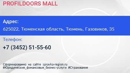 PROFILDOORS MALL по адресу 625022, Тюменская область, Тюмень, Газовиков, 35 в дальнейшем Организация, размещена в следующих категориях: