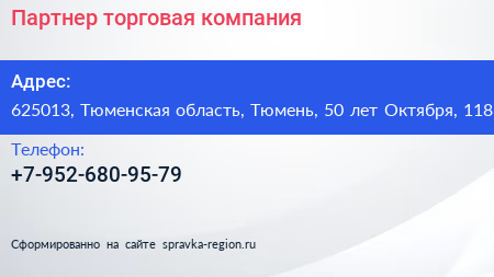 Партнер, торговая компания по адресу 625013, Тюменская область, Тюмень, 50 лет Октября, 118 в дальнейшем Организация, размещена в следующих категориях: