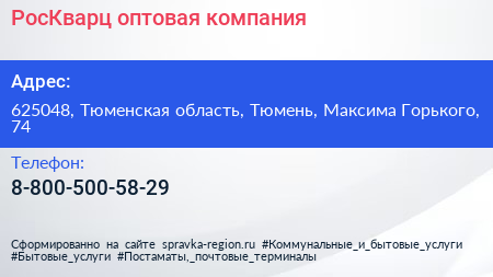 РосКварц, оптовая компания по адресу 625048, Тюменская область, Тюмень, Максима Горького, 74 в дальнейшем Организация, размещена в следующих категориях: