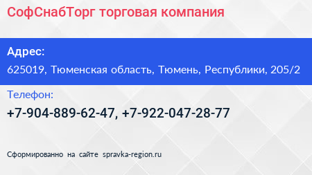 СофСнабТорг, торговая компания по адресу 625019, Тюменская область, Тюмень, Республики, 205/2 в дальнейшем Организация, размещена в следующих категориях:
