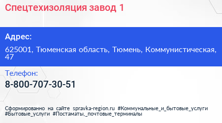 Спецтехизоляция, завод №1 по адресу 625001, Тюменская область, Тюмень, Коммунистическая, 47 в дальнейшем Организация, размещена в следующих категориях: