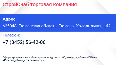 СтройСнаб, торговая компания по адресу 625048, Тюменская область, Тюмень, Холодильная, 142 в дальнейшем Организация, размещена в следующих категориях: