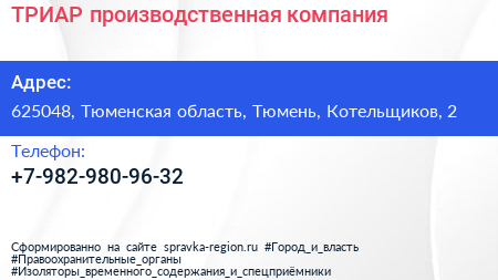 ТРИАР, производственная компания по адресу 625048, Тюменская область, Тюмень, Котельщиков, 2 в дальнейшем Организация, размещена в следующих категориях: