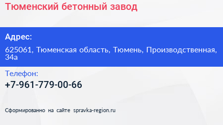 Тюменский бетонный завод по адресу 625061, Тюменская область, Тюмень, Производственная, 34а в дальнейшем Организация, размещена в следующих категориях: