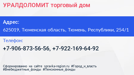 УРАЛДОЛОМИТ, торговый дом по адресу 625019, Тюменская область, Тюмень, Республики, 254/1 в дальнейшем Организация, размещена в следующих категориях: