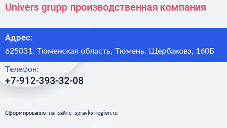 Univers grupp, производственная компания по адресу 625031, Тюменская область, Тюмень, Щербакова, 160Б в дальнейшем Организация, размещена в следующих категориях: