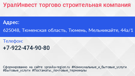 УралИнвест, торгово-строительная компания по адресу 625048, Тюменская область, Тюмень, Мельникайте, 44а/1 в дальнейшем Организация, размещена в следующих категориях:
