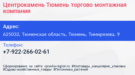 Центрокамень-Тюмень, торгово-монтажная компания по адресу 625032, Тюменская область, Тюмень, Тимирязева, 9 в дальнейшем Организация, размещена в следующих категориях: