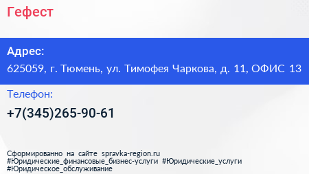Гефест по адресу 625059, г. Тюмень, ул. Тимофея Чаркова, д. 11, ОФИС 13 в дальнейшем Организация, размещена в следующих категориях:
