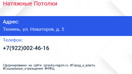 Натяжные Потолки по адресу Тюмень, ул. Новаторов, д. 5 в дальнейшем Организация, размещена в следующих категориях: