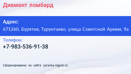 Диамант, ломбард по адресу 671260, Бурятия, Турунтаево, улица Советской Армии, 9а в дальнейшем Организация, размещена в следующих категориях: